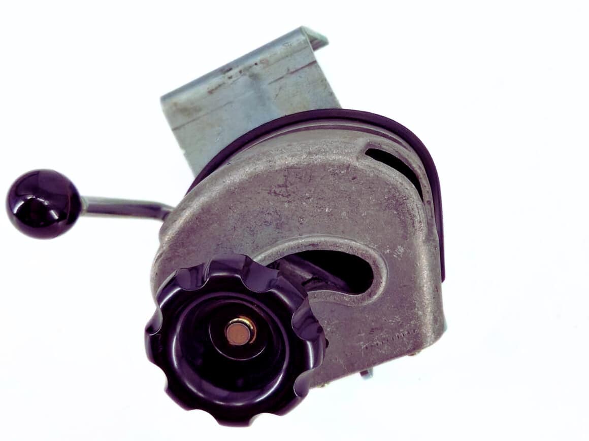 • Nahaufnahme eines Handgashebels für IVECO, mit einer mechanischen Komponente aus Metall und einem schwarzen Kunststoffknopf und -hebel, dargestellt vor einem weißen Hintergrund.