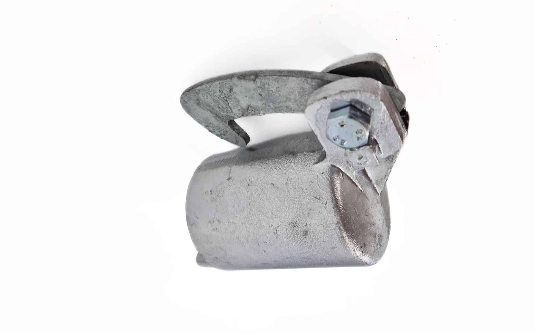 Die Endkappe Aluminium mit Hakenverschluss ist ein mechanisches Metallteil mit einem zylindrischen Körper, einem gebogenen Hakenverschluss und einem sichtbaren Bolzen auf einer Seite, isoliert auf einem weißen Hintergrund dargestellt.