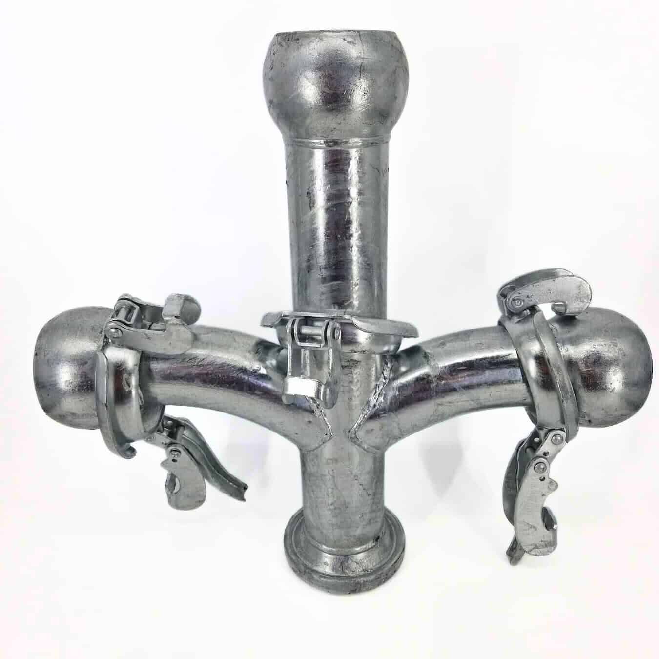 Vierwegeabweichung HK108 Rohrverbinder mit Klemmen an zwei horizontalen Enden, aufrecht stehend vor weißem Hintergrund.